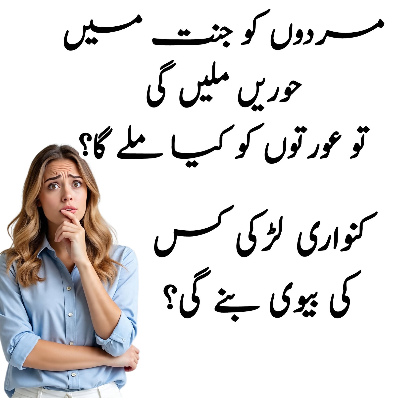 مردوں کو جنت میں حوریں ملیں گی تو عورتوں کو کیا ملے گا؟ جنت میں عورتوں کا کیا حصہ ہوگا؟ آج کل لوگ یہ سوال کرتے ہیں کہ مردوں کو جنت میں حوریں ملیں گی، تو عورتوں کو کیا ملے گا؟ اور اگر کوئی کنواری لڑکی دنیا میں فوت ہوجائے، تو جنت میں
